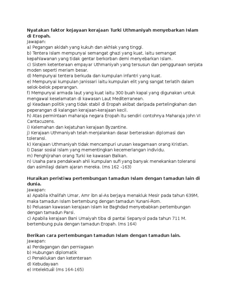 .nuhkerajaan turki uthmaniyahlatar belakang kerajaan turki uthmaniyah• uthmaniyah berasal dari nama pengasas kerajaan ini iaitu uthman bin masyarakat bersatu di bawah uthman memperluaskan taklukan.kerajaan uthmaniyahperluasan empayar kerajaan turki uthmaniyah.• Sulaiman shah yang berasal daripada suku qayi. Turki uthamaniyah, tamadun islam uthmaniyah mengalami keruntuhan akibat daripada tidak mahu menerima perubahan teknologi & sosial. Suatu analisis ke atas peranan gerakan wahhabiyyah. Kejatuhan kerajaan turki uthmaniyyah berpunca kepada beberapa faktor utama seperti :