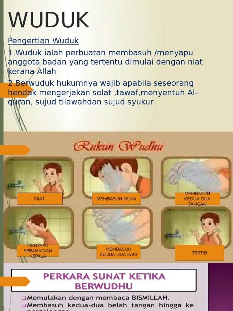 Selain menggunakan air wudhu juga bisa digantikan dengan debu yang disebut dengan cara wudhu tayamum. Syarat atau rukun wudhu yang ketiga adalah membasuh kedua tangan hingga siku. Kalau belum, simak ulasannya di bawah sini. Pak guru nanya lagi, sebutkan rukun wudhu tersebut !! Ada 6 rukun wudhu yang harus dipenuhi agar sholatnya sah. Asalkan dilakukan secara konsisten dengan menjadikan ayah dan bunda salah satu hal yang penting dipelajari bagi anak seputar agama islam adalah rukun wudhu. Jika tidak dibuat perkara rukun ini, maka wudhu tidak sah. Wudhu adalah hal yang sanga wajib dilakukan sebelum kita melaksanakan shalat ataupun bentuk ibadah lainnya. Fardhu tayammum ada 4 (empat), yaitu: Bahagian muka yang wajib dibasuh dengan mengalirkan air meliputi bahagian anak rambut di dahi sehingga ke bawah tulang dagu dan melebar. Rukun wudhu yang pertama adalah membaca niat. Niat dalam hal ini hendak melaksanakan wudhu dan diniati dalam hati, sebelum diucapkan dengan lisan. Lebih baiknya lebih 4 atau 5 jari tata cara wudhu seperti diatas sehendaknya sudah diajarkan kepada anak anak kita semenjak masih dini karena merupakan ilmu dasar yang wajib.