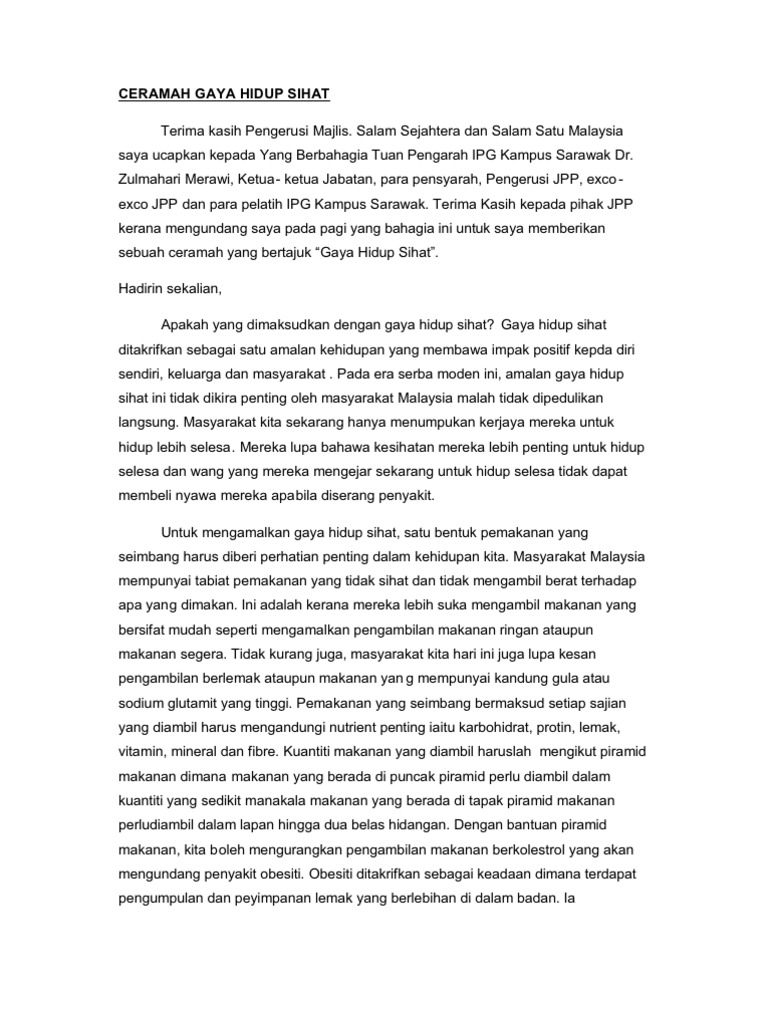 Contoh Karangan Amalan Gaya Hidup Sihat from img.pdfslide.net Jelaskan peranan ibu bapa dalam usaha memupuk amalan gaya hidup sihat. Huraikan pendapat anda tentang amalan gaya hidup sihat yang sewajarnya dipraktikkan oleh setiap individu. Setiap ahli keluarga memainkan peranan penting ke arah melahirkan gaya hidup sihat. Ceramah gaya hidup sihat karangan spm 2014amalan gaya hidup sihat masyarakat kita. Amalan gaya hidup sihat adalah cara hidup yang boleh mengurangkan pelbagai risiko penyakit pada masa hadapan. Rehat yang mencukupi memainkan peranan penting dalam pengamalan gaya hidup sihat. 📄 dapatkan ganjaran dengan menjawab soalan melalui soal selidik dalam talian. Karangan gaya hidup sihat stpm.