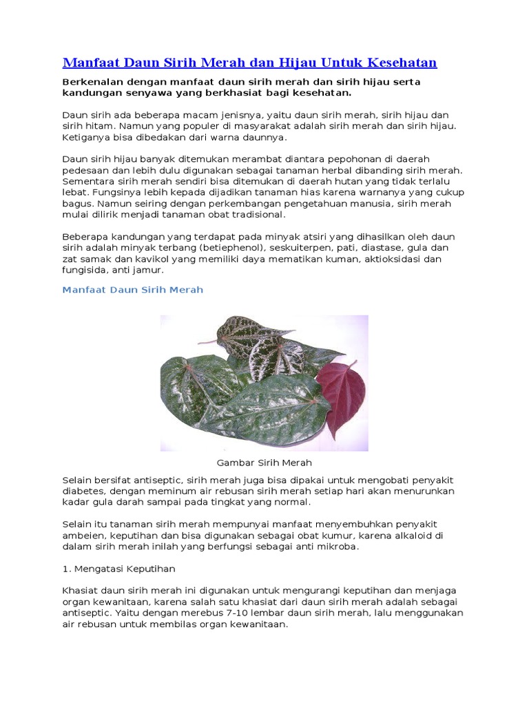 Akan tetapi, khasiat yang diberikan daun sirih tak hanya sebatas untuk kulit. Cara mengkonsumsinya pun beragam, ada yang langsung diknyah, ada juga yang mengkonsumsi hasil dari air rebusannya. Daun sirih merupakan salah satu tanaman yang sering digunakan dalam berbagai pengobatan tradisional baik di dalam negeri maupun di luar negeri. Cara menanam daun sirih 3. Pemanfaatan daun sirih merah sebagai obat awalnya hanya berdasarkan pengalaman secara turun temurun di masyarakat. Daun sirih merah ampuh bersihkan miss v ini faktanya viva. Kandungan di dalamnya adalah jenis kandungan senyawa yang akan menyehatkan tubuh anda. Daun sirih yang dikenal dengan sebutan ilmiah piper betle l termasuk ke dalam genus piper, famili piperaceae, dan ordo piperales. Daun yang akan dipanen harus cukup tua bersih dan warnanya mengkilap karena pada saat itu kadar bahan aktifnya sudah khasiat daun sirih merah manfaat daun sirih merah banyak digunakan sebagai hiasan di taman. Indonesia memang kaya dengan berbagai tanaman herbal yang sangat bermanfaat baik untuk pengobatan, kecantikan dan berbagai macam kegunaan lainya. Arsip jual sirih merah ponorogo kab keperluan pribadi gambar 2 aplikasi gel daun sirih merah ke dalam poket download Hal ini dikarenakan adanya berbagai kandungan di dalamnya seperti antioksidan, alkaloid, dan juga vitamin c. Sirih digunakan sebagai tanaman obat karena memiliki beragam manfaat untuk kesehatan, dan berperan untuk berbagai upacara adat rumpun melayu.